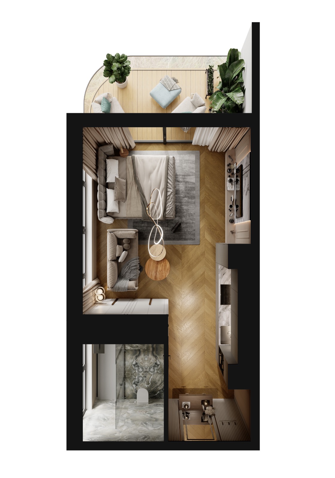 Designed for urban lifestyles, the studio seamlessly combines living, dining, and sleeping areas into one cohesive environment. The modern kitchenette is fitted with durable countertops and ample storage, ensuring convenience without compromising on style.
